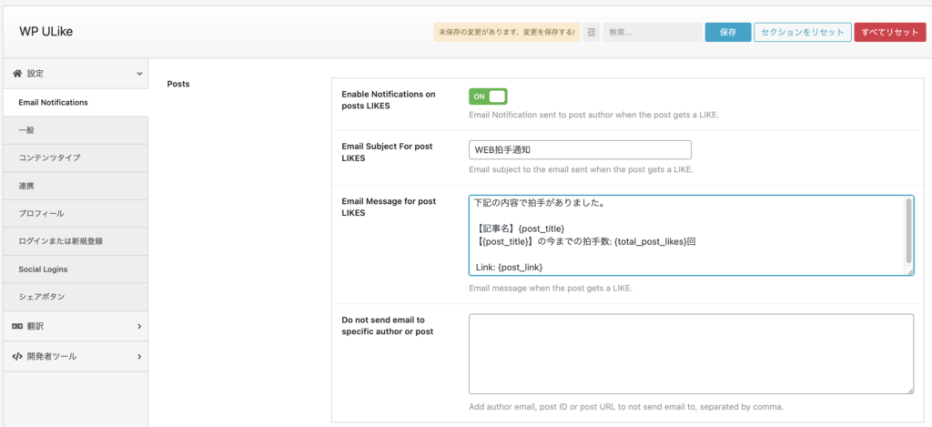 WP ULikeのプラグインを見ると「Email Notification」の項目が追加されています。