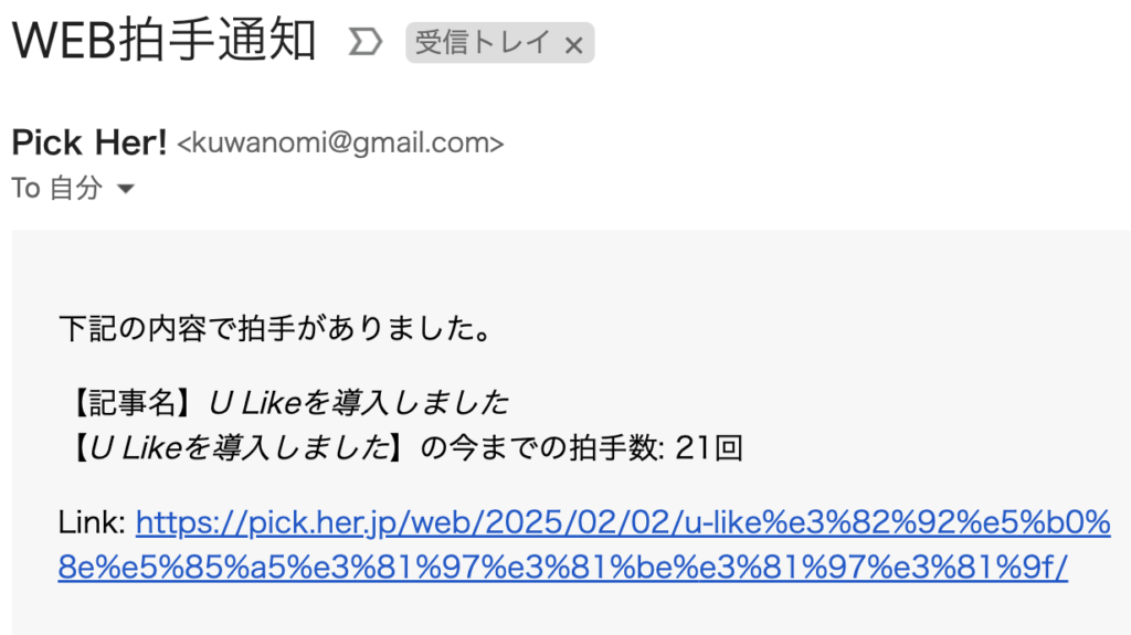 そうするとボタンを押してもらうたびにこんな感じでメールが届きます。