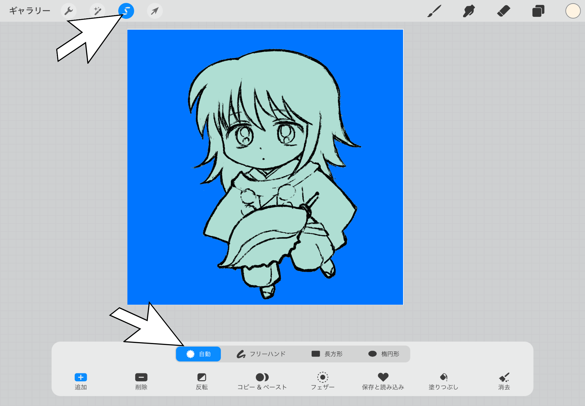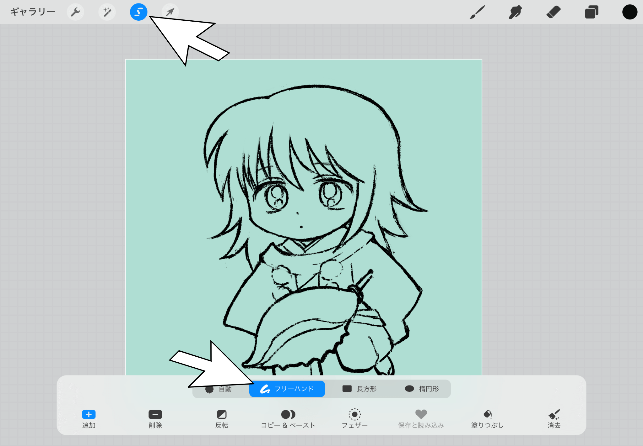 Procreateの選択は、ずっと画面に当ててなくても、ピッピッピッ とポイントポイントをタッチする形でも大丈夫です。
