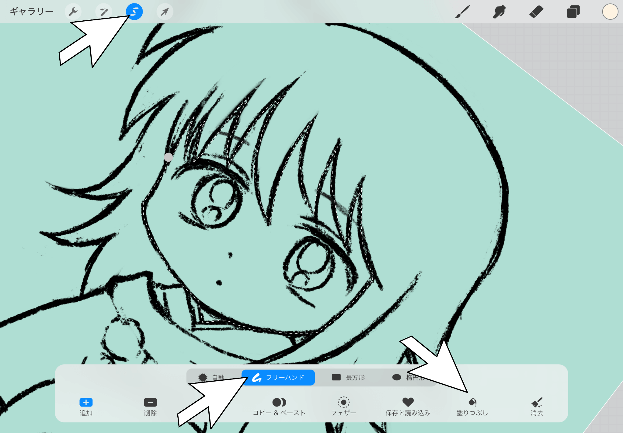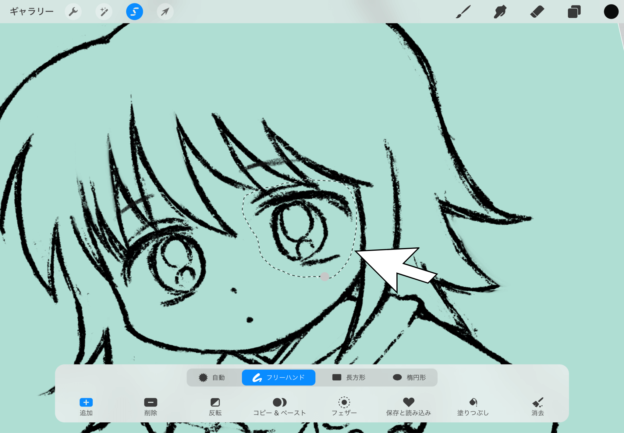 「S」のようなマークをクリックし、「フリーハンド」を選び、塗りたいところを選ぶ。