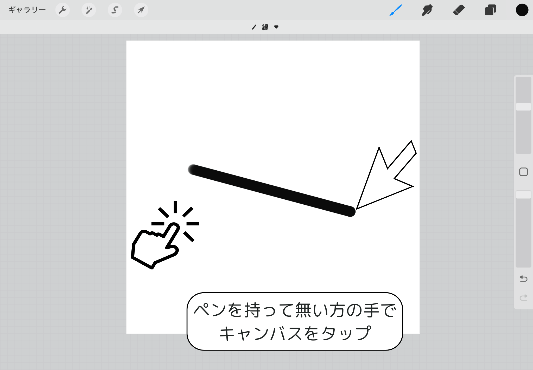 ▲ペンを持っていない方の点でキャンバスをタップしながらペンを動かすと、15度ずつ傾けます。