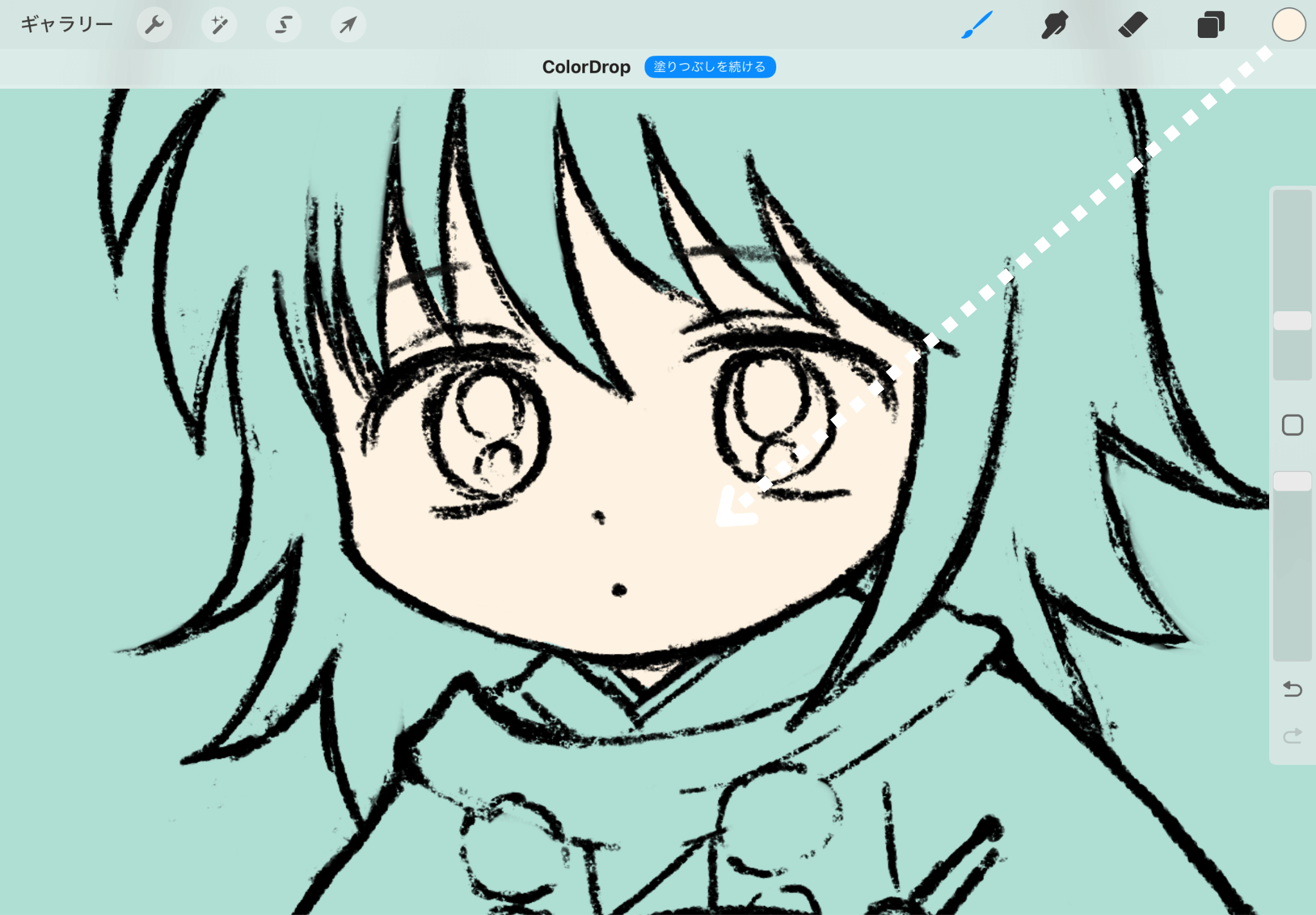 また、上の方に出る「塗りつぶしを続ける」をクリックすると、その後はドラッグしなくても塗りたいところをクリックするだけでその線の中も色塗りができます。