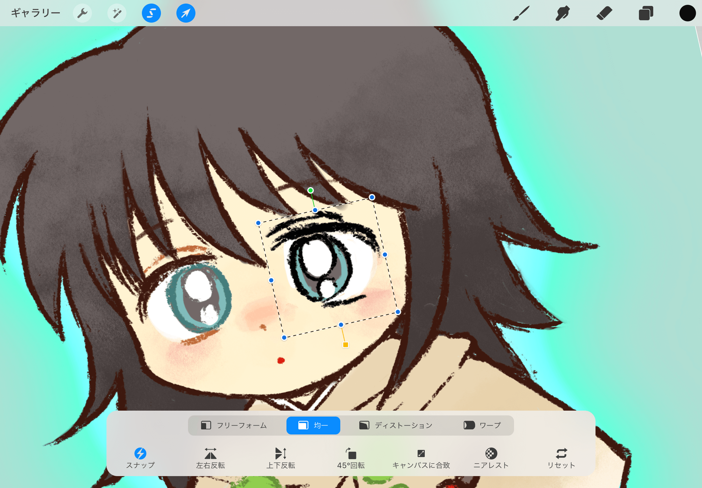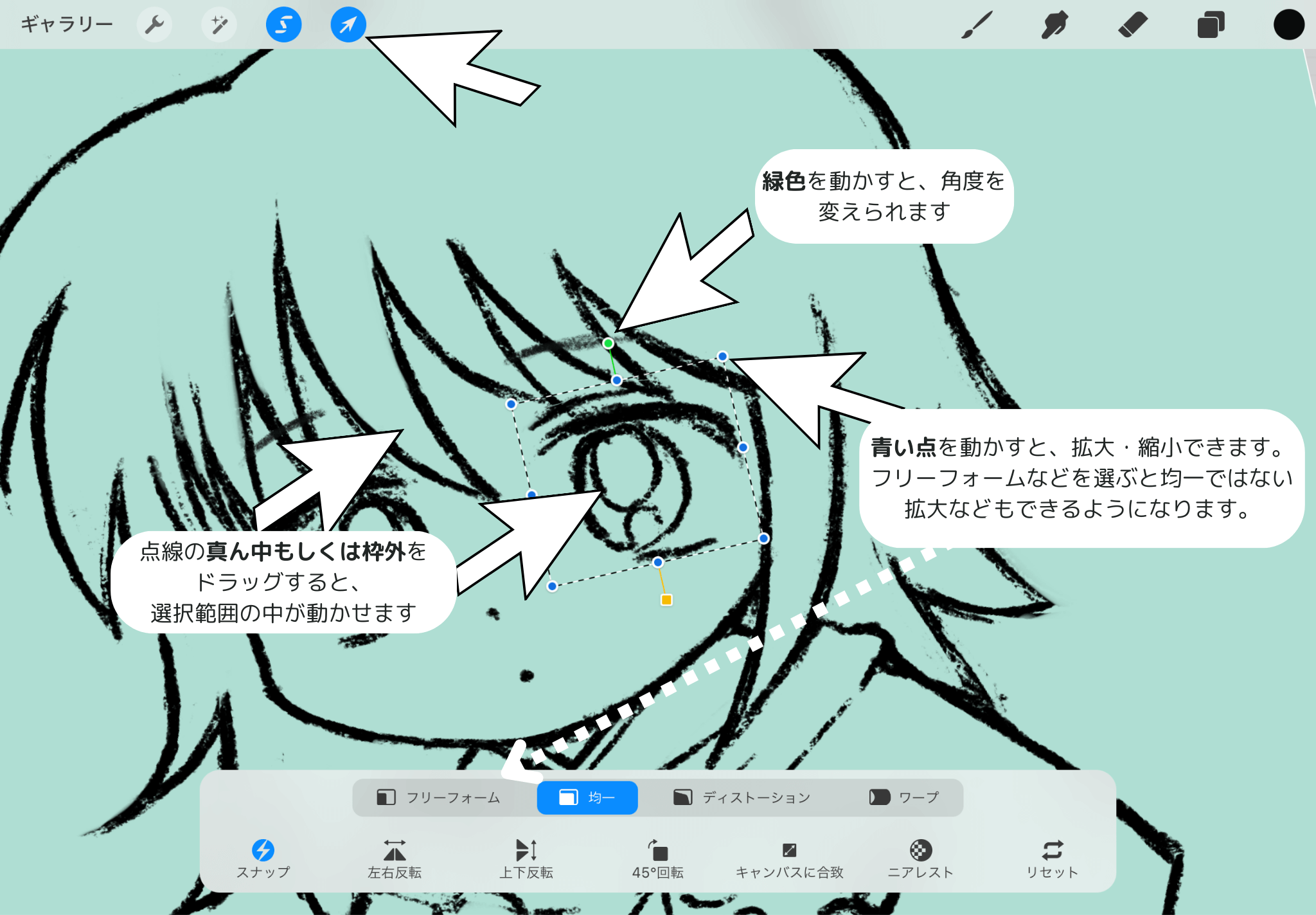 サイズを変えたいとき:青い点を動かします。下のメニューで「均一」を選んでいる場合はそのまま拡大しますが、「フリーフォーム」「ディストーション」「ワープ」を選ぶと、歪んだ拡大・縮小が可能です。