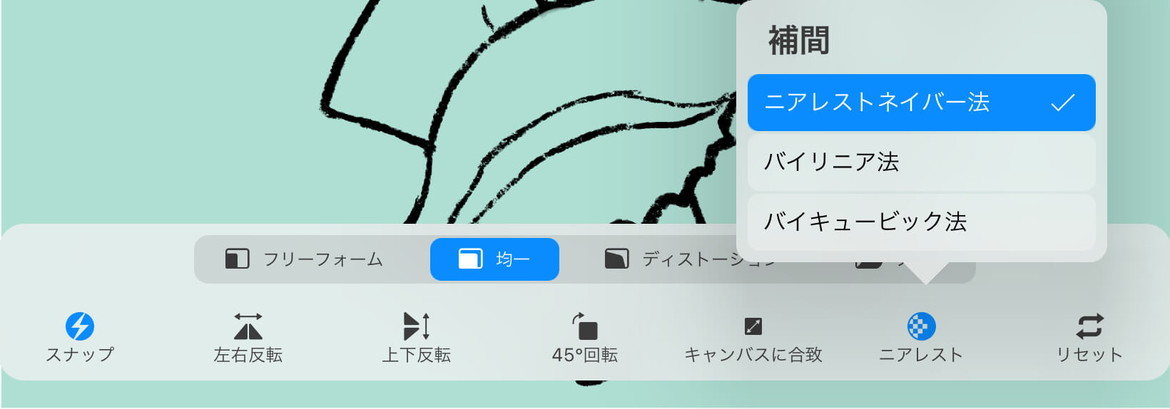 ▲なお、シャープなブラシで線画に使用している場合は、拡大の際に「ニアレストネイバー法」を選ぶと綺麗に拡大できます。