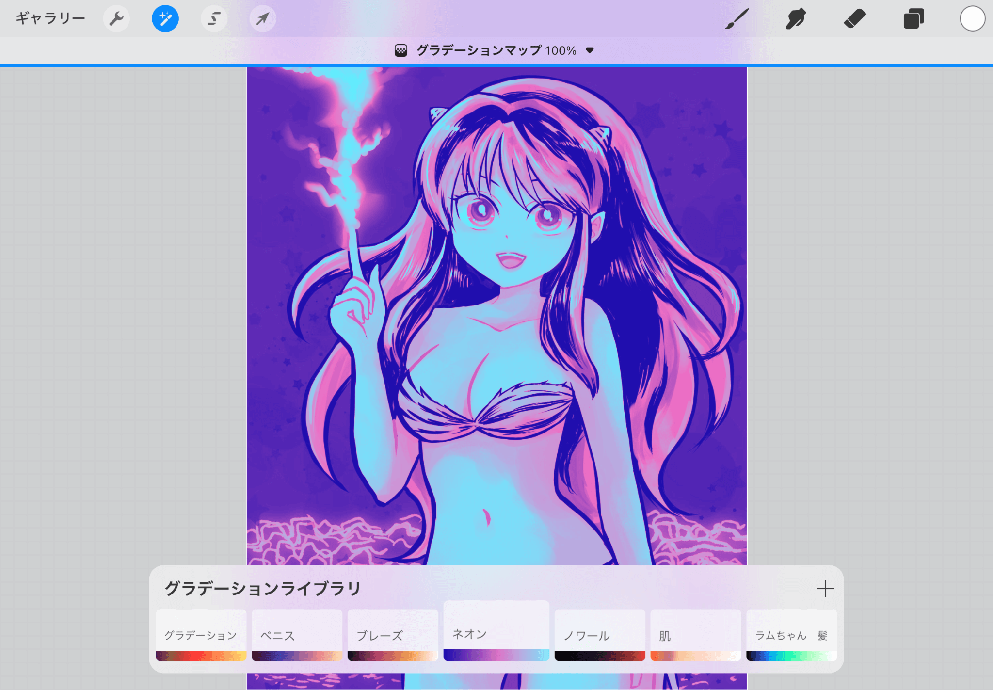 ▲上のレイヤーを選択し、ネオンのグラデーションマップをかけてみます。