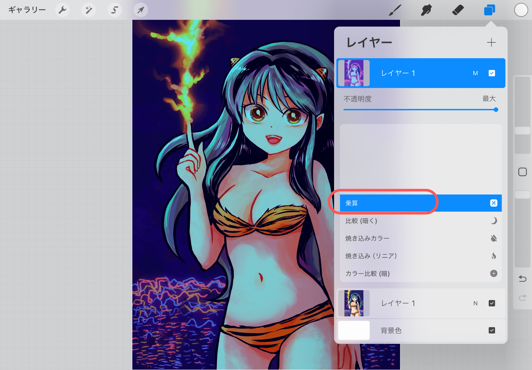 ▲グラデーションマップをかけたレイヤーを「乗算」にしてみる。