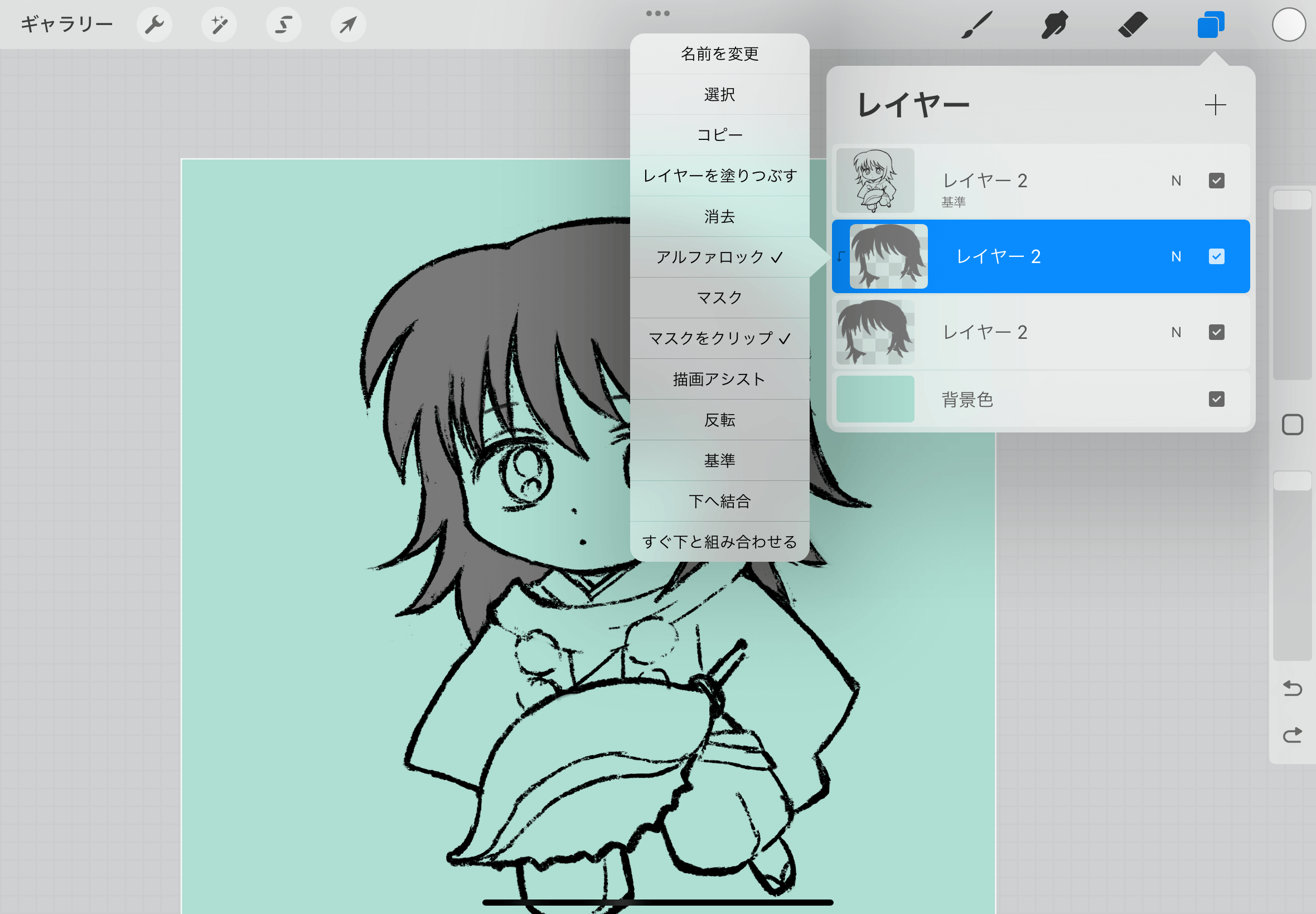 上の方のレイヤーは「アルファロック」を外します。