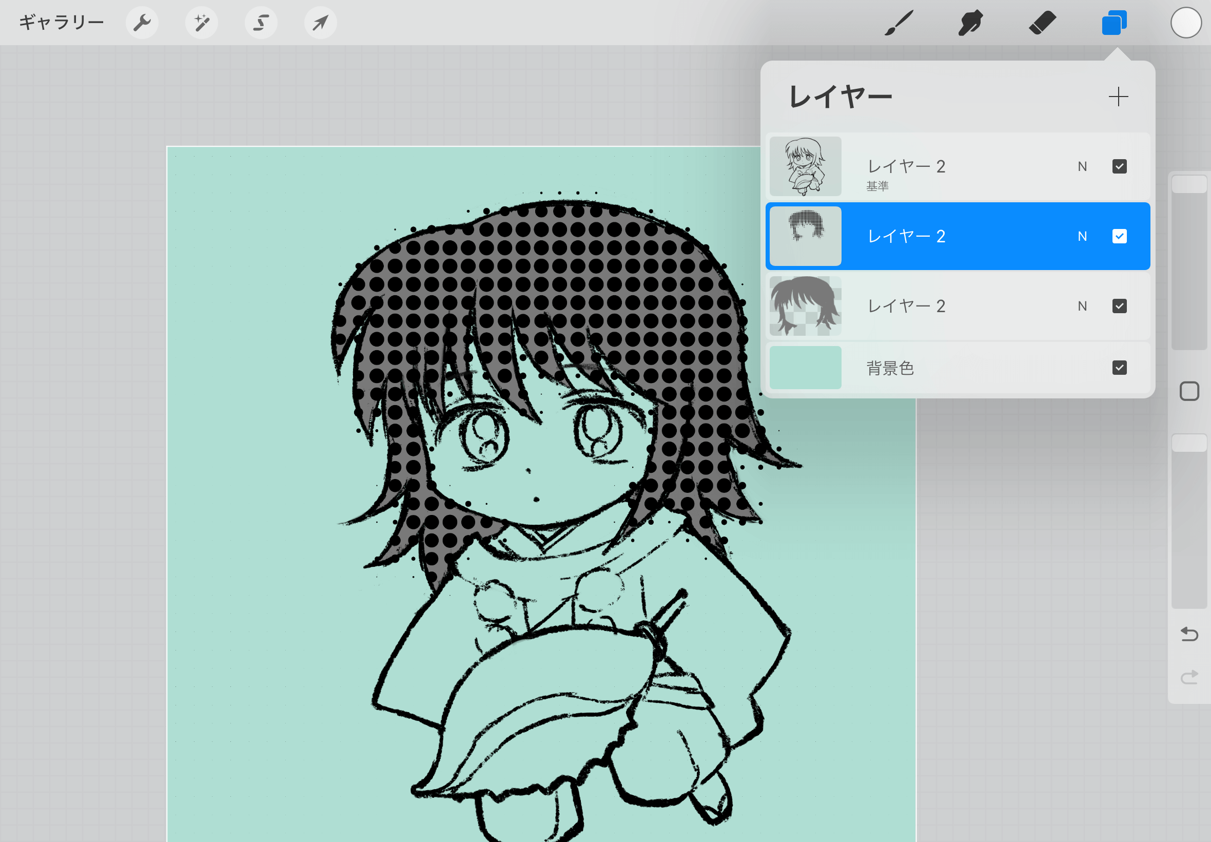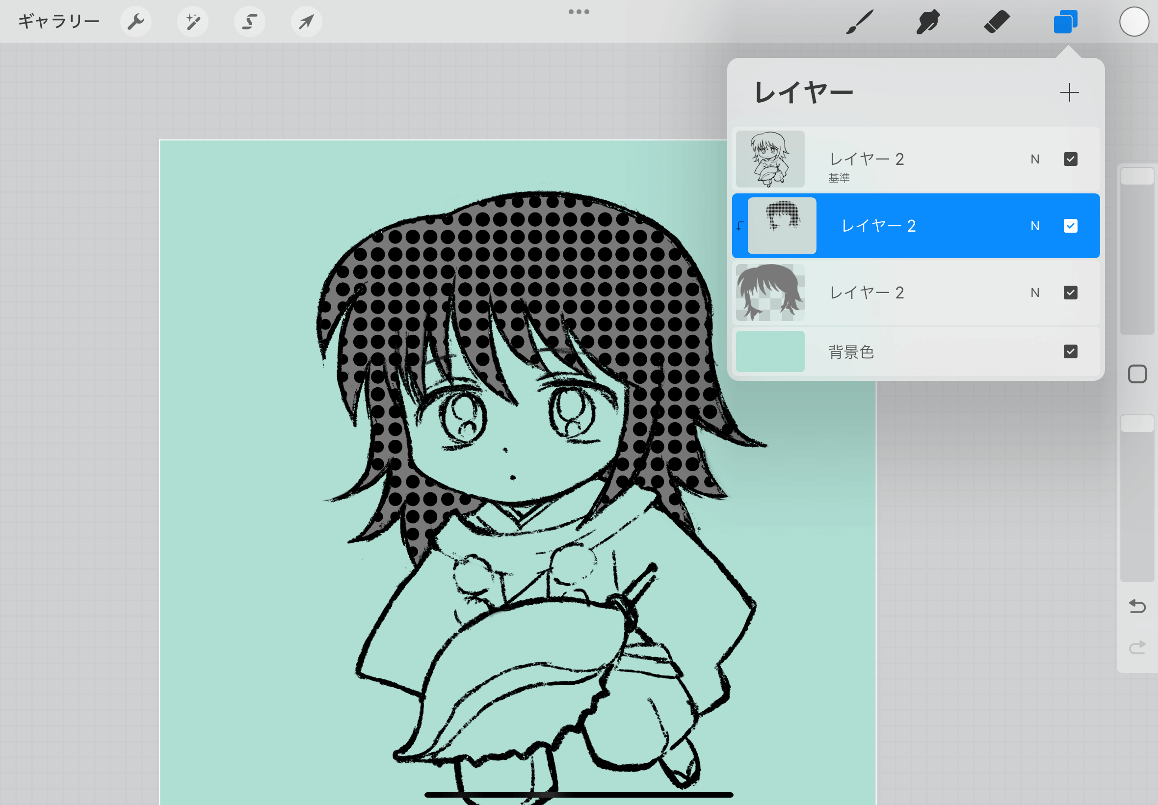▲ハーフトーンレイヤーの「アルファロック」を解除し、グレーの髪の毛のレイヤーを削除します。