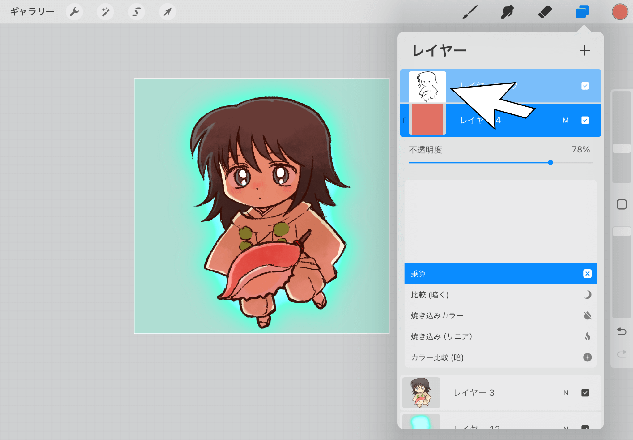 ▲下の親レイヤーの方に色を流し込みます。この例では「乗算」の茶色にしました。